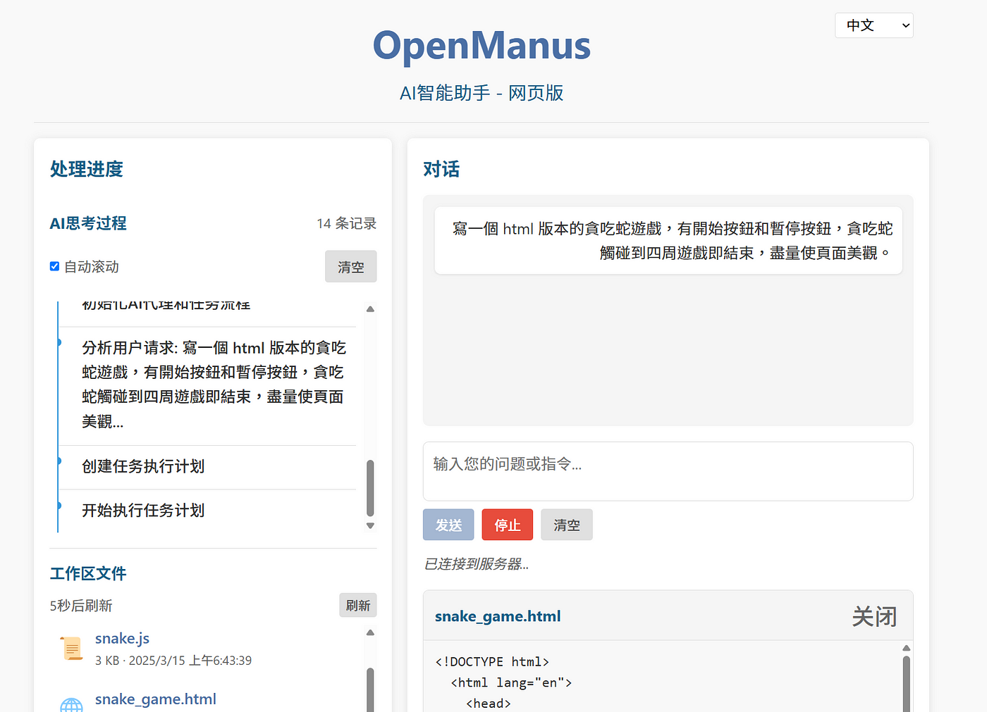 啟動後便會在 http://localhost:8000/ 找到網頁介面,我請他幫我做一個貪吃蛇遊戲,過程 AI 新增的文件都可以在左下方看到。