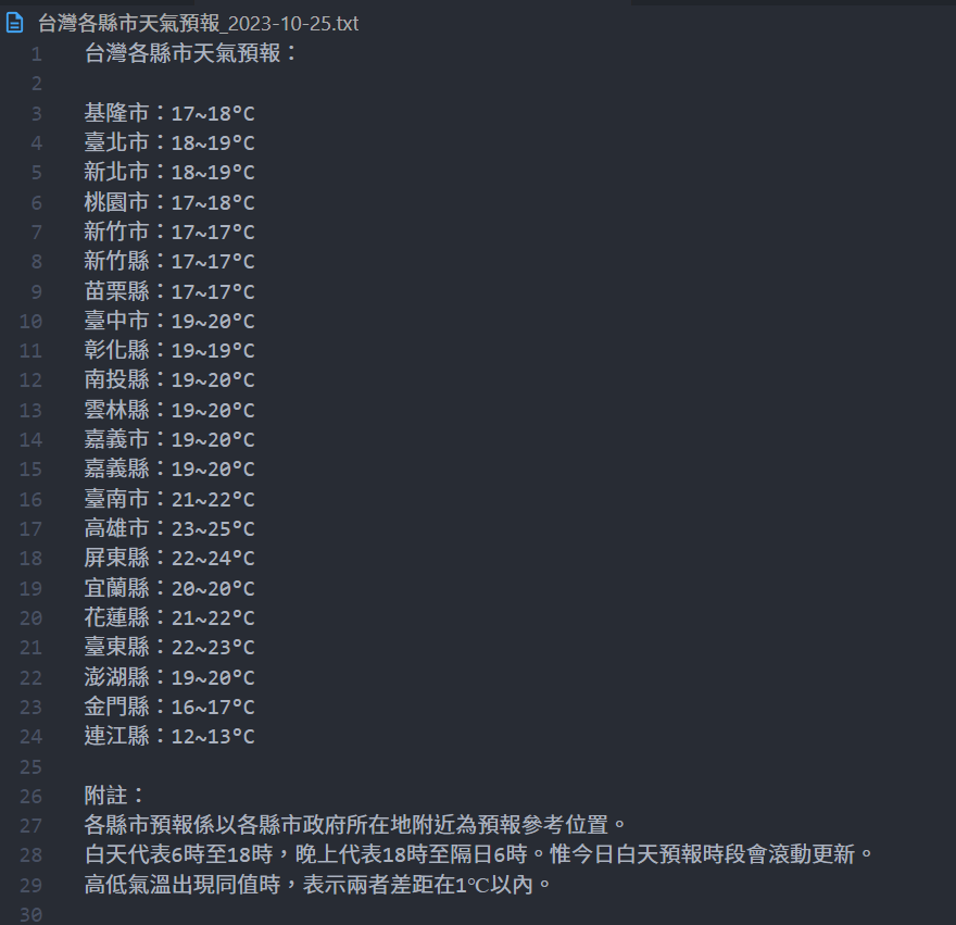 由於我有跟他說要「整理成 txt 儲存下來」,因此後面的步驟它會調動 file_saver 來儲存,我測試沒有特別講要儲存的話,OpenManus 有時候便不會進行這步。以下是 OpenManus 的報表,首先搜尋的內容大多沒有問題,但如果指令沒說清楚,它便會偷懶,如我只講了天氣,沒有要溫度與濕度,它就只會搜尋溫度的部分。另外你可以看到檔案名稱是 台灣各縣市天氣預報_2023–10–25.txt ,日期很明顯的錯誤,這部分要使用的人也可以注意。