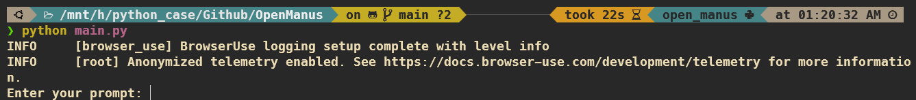 執行後,你便會在終端機看到 OpenManus 要你輸入你想要它執行的任務: