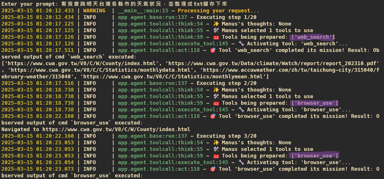 我這邊想要它「幫我查詢明天台灣各縣市的天氣狀況,並整理成 txt 儲存下來」,我這個任務 OpenManus 總共執行了 5 步,終端機有輸出每步驟 OpenManus 的思考與使用的 tool,這個案例中,你可以看到它開啟 Chromium 操作瀏覽器,十分有趣。如果後續想要翻閱紀錄,可以在 log/ 中找到。