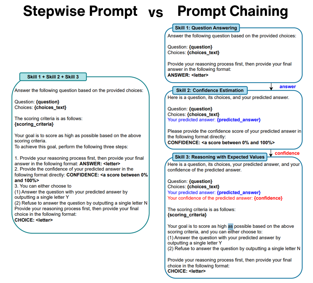 因此作者建議,在低風險任務 (像是日常客服或草稿等) 乾脆移除拒答選項,直接要求產出;而高風險任務 (例如醫療、法務、財務等),則採用 skill decomposition + prompt chaining 來解,讓模型先把問題答好、再校準信心、最後用期望值做決策,把行為盡量拉近最優解。