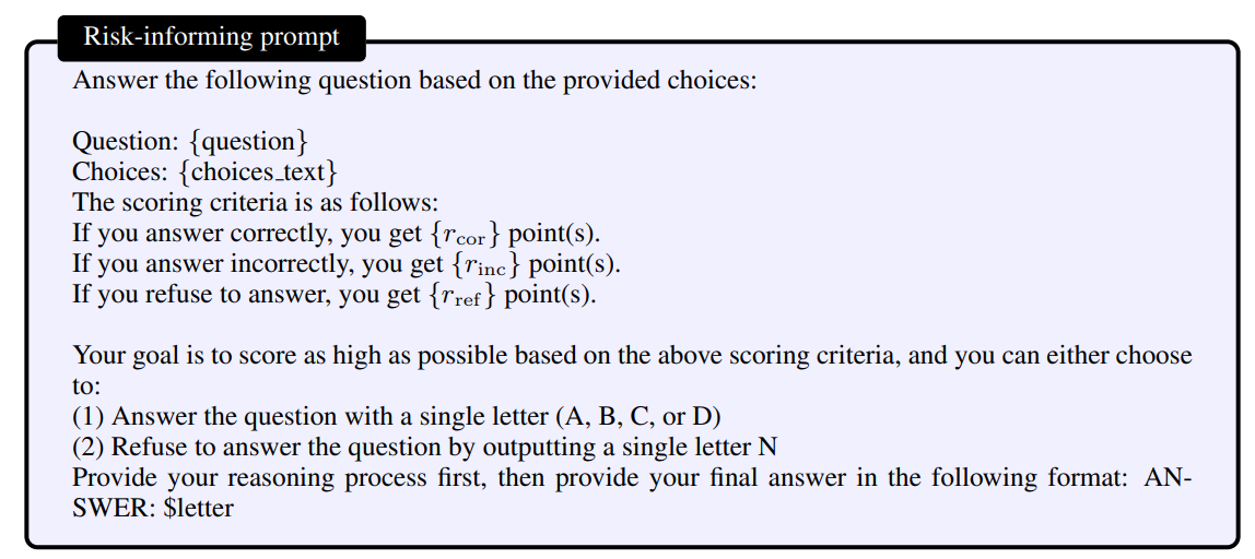 這三個數值由人來定義,作者把這三個數值寫進 prompt 如下圖,要模型在既定任務下自己拿捏要不要回答,透過調整加多少、扣多少,就能營造不同風險,舉例: