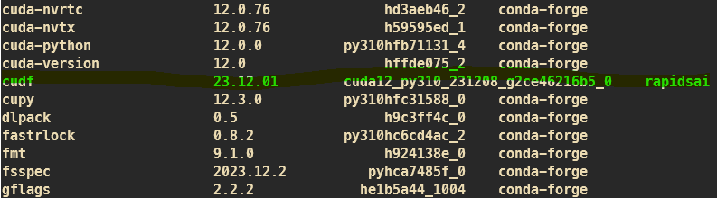 如果你照著上面的指令安裝,那麼安裝完後會建立一個新的 conda env: rapids-23.12,進到 env 中就可以檢查 cudf 是否安裝成功。