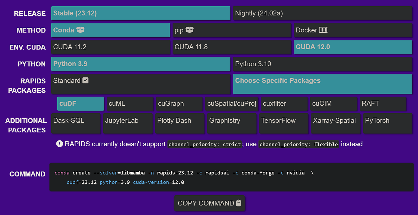 安裝完後就可以在 rapids 的 官網 上找到你對應的安裝指令: