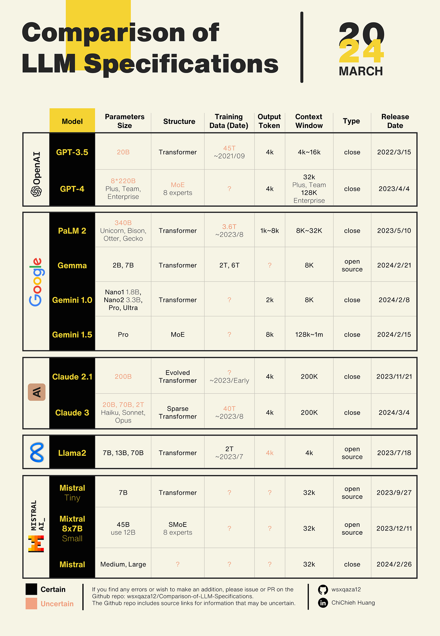 這份整理表我有放在 Github: Comparison-of-LLM-Specifications ,在 Github 中你可以找到各個不確定訊息的來源,另外如果你在其中有發現任何錯誤、想要討論,或是有新的資料想要補充,非常歡迎你提出 issue 或提交 PR,期望能透過這種方式不斷地完善這份文件,也高資料的質量。我希望這份工作能夠為對機器學習和人工智能發展感興趣的人提供價值,無論你是一名研究人員、開發者,還是僅僅是一位愛好者。