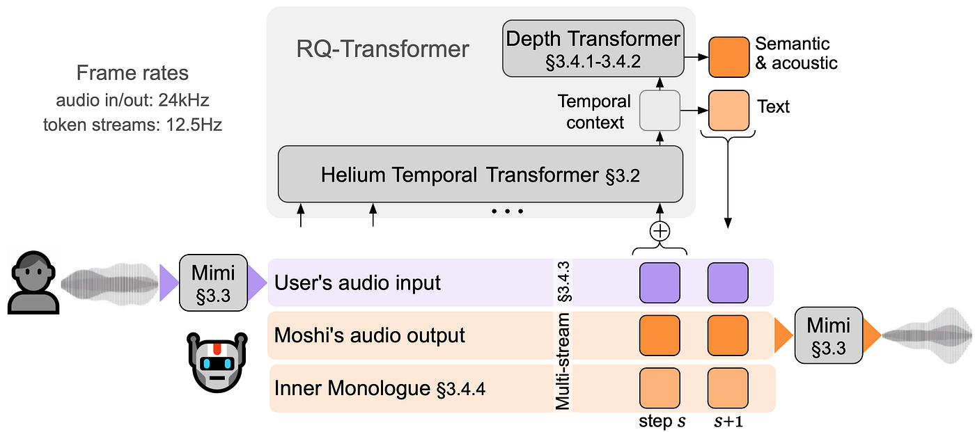 - 語音輸出: 聲學 Token 再送到 MIMI 解碼器 ,轉換成真實的語音波形。